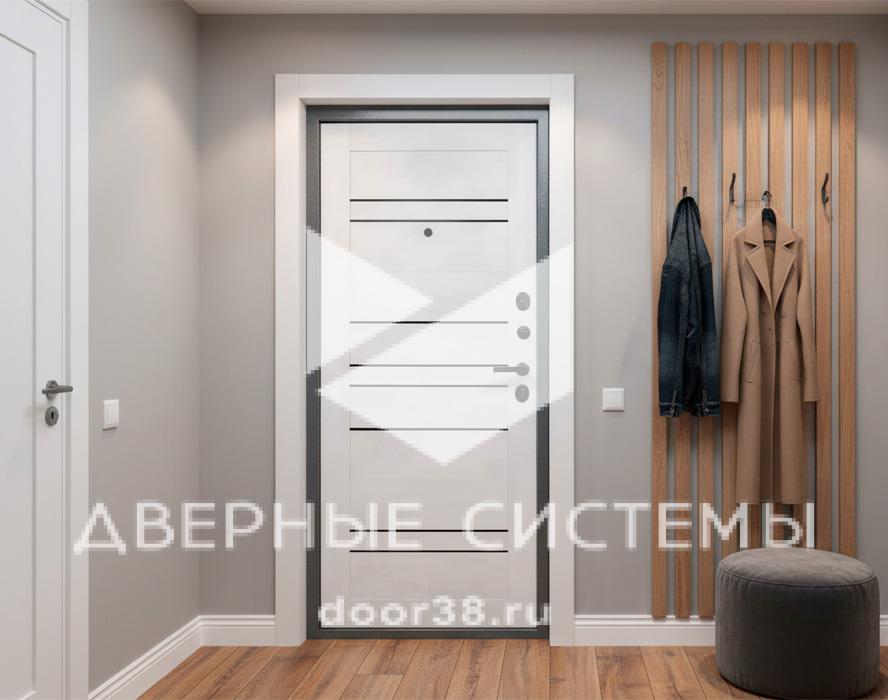 - Внутренняя отделка выполнена из царговой панели толщиной 16мм со вставками из черного стекла и покрыта изностойкой пленкой в цвете «Бетон снежный».