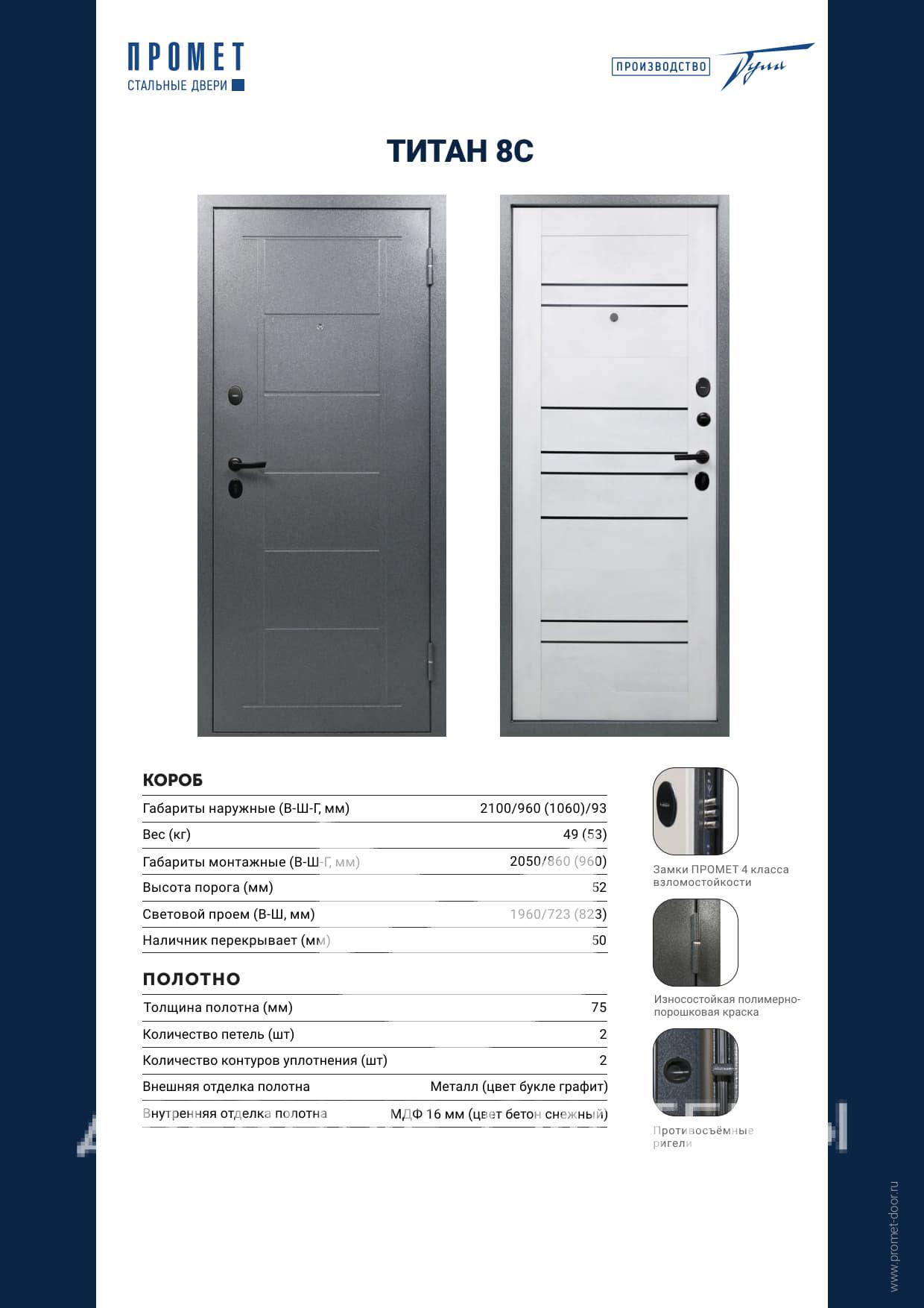 Металлическая входная дверь Титан 8С предназначена для установки в квартирах и иных жилых помещениях. Комплектуется двумя разносистемными замками Промет 4 (наивысшего) класса взломостойкости, а также черной фурнитурой.